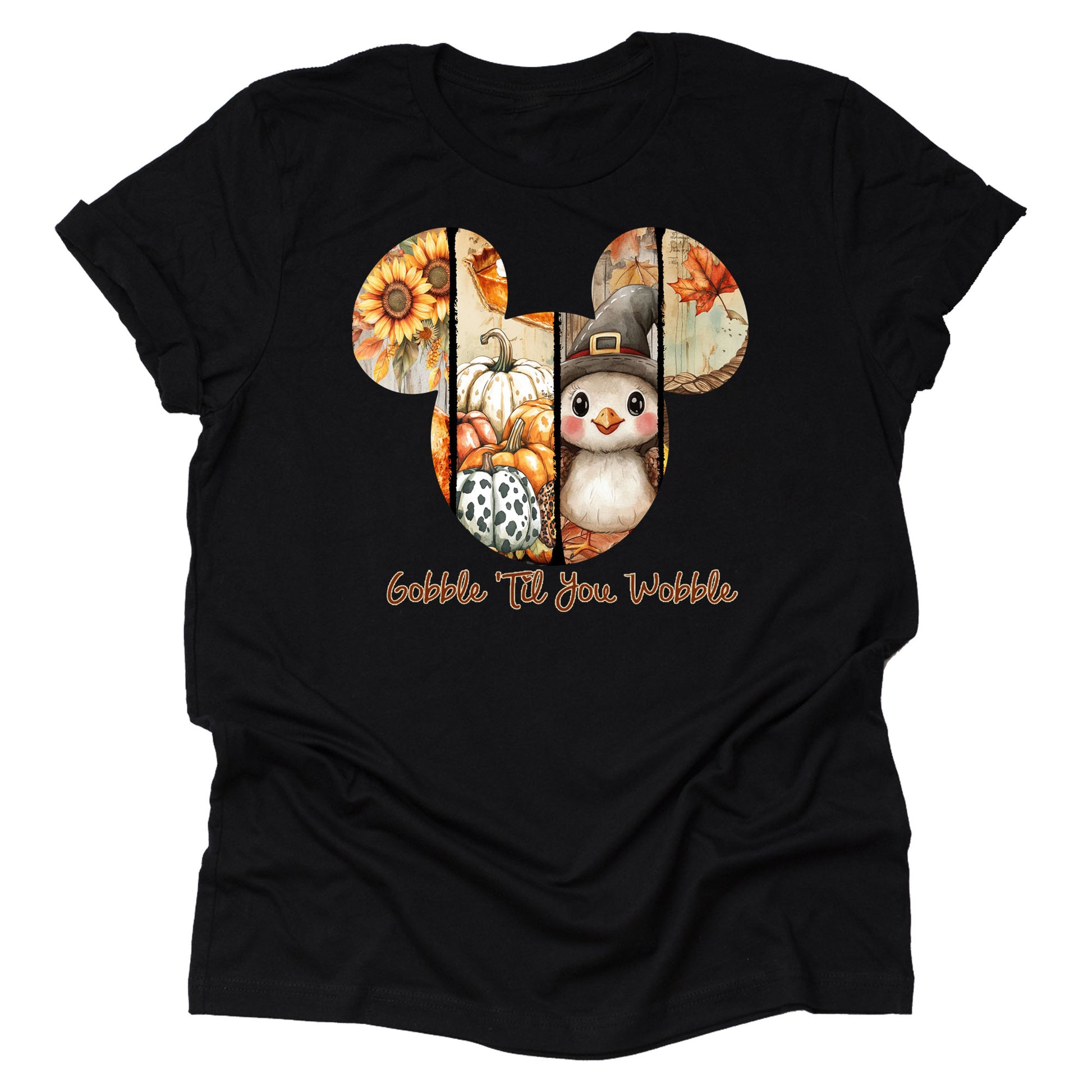 Celebrate the season of gratitude in style with our Mickey Gobble Until You Wobble T-Shirt. Featuring a cozy fall-inspired design with rustic pumpkins, cheerful sunflowers, and warm harvest tones, this graphic tee is perfect for Thanksgiving gatherings, pumpkin patch visits, or simply enjoying the crisp autumn air.