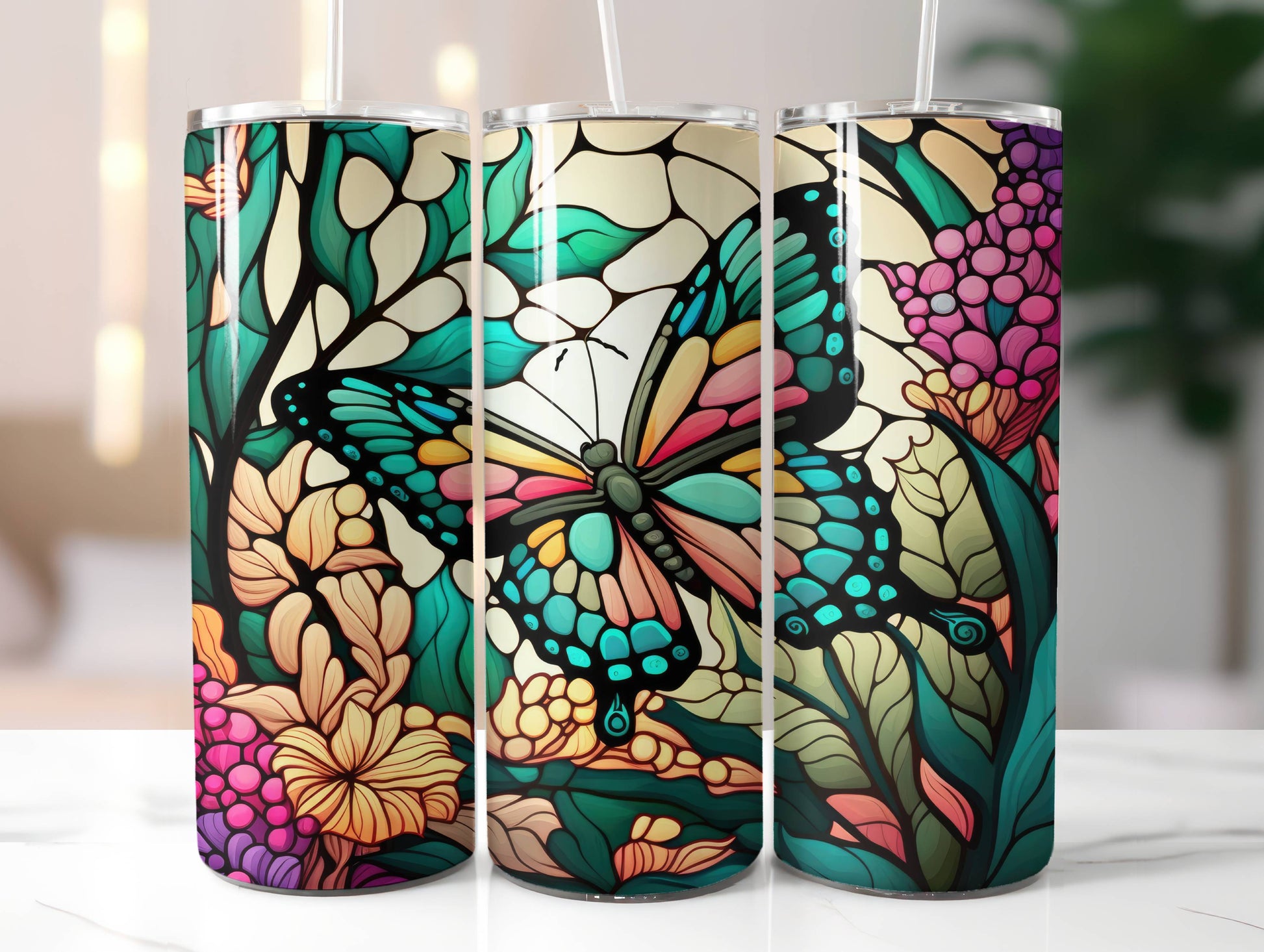 Ideal for travel or daily use, this 20-ounce reusable water bottle is an eco-friendly choice that reduces single-use plastic waste. Its compact yet ample capacity strikes a perfect balance between portability and hydration, making it the go-to companion for staying refreshed throughout the day. Elevate your beverage experience with the Butterfly Stained Glass Insulated Tumbler Cup – a stylish and reliable accessory that not only adds a touch of magic to every sip but also reflects your commitment to sustainability in a charming way.